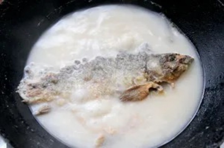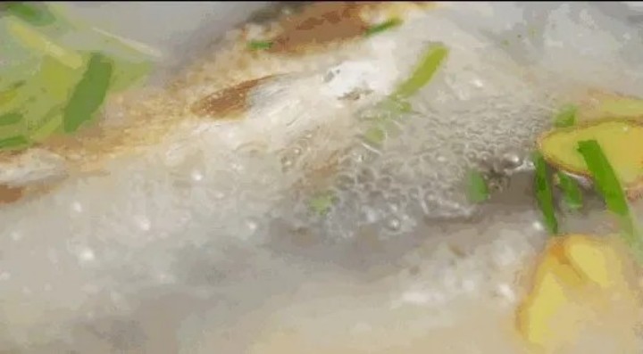 (3)倒入一定量的开水继续煮5分钟,可以看到鱼汤慢慢变白,越煮越浓白;
