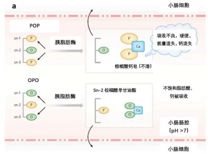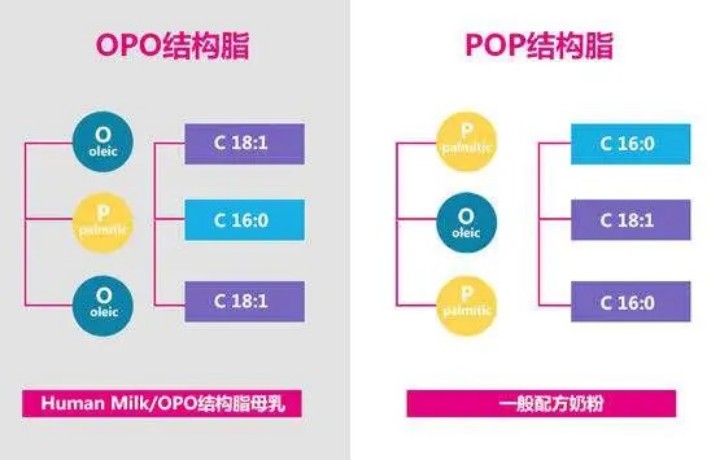 其次,母乳中60-70%的棕榈酸(C16:0)0和油酸(C18:1)结构是以“OPO的结构”,即甘油三酯中一三位是结合油酸为主,二位结合棕榈酸为主,这种结构比我们常见的植物油中的POP结构,更适合婴幼儿消化吸收。