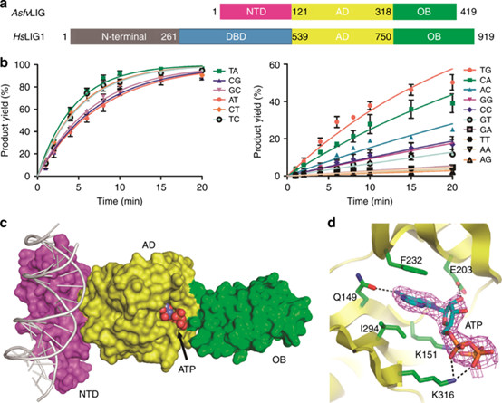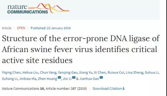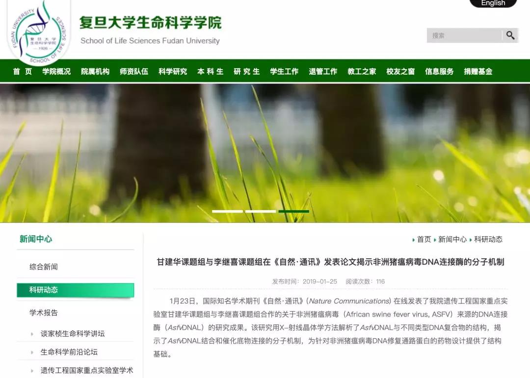 2019年1月23日,国际知名学术期刊《自然·通讯》(Nature Communications) 在线发表了复旦大学及四川大学关于非洲猪瘟病毒(African swine fever virus, ASFV)来源的DNA连接酶(AsfvDNAL)的研究成果。
