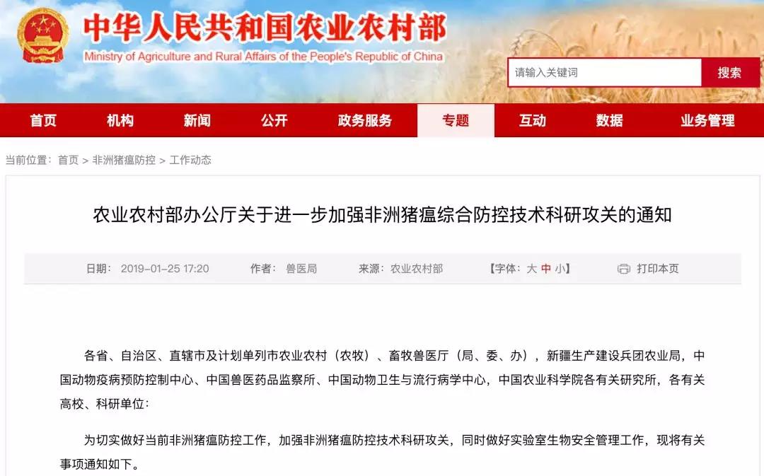 为切实做好当前非洲猪瘟防控工作,加强非洲猪瘟防控技术科研攻关,2019年1月25日,农业农村部办公厅关于进一步加强非洲猪瘟综合防控技术科研攻关的通知,通知要求重点推进非洲猪瘟疫苗创制,积极开展技术合作,各级各类农业科研单位要充分利用相关高校、科研院所等单位的技术和硬件条件,联合开展技术攻关,加快研发进程。