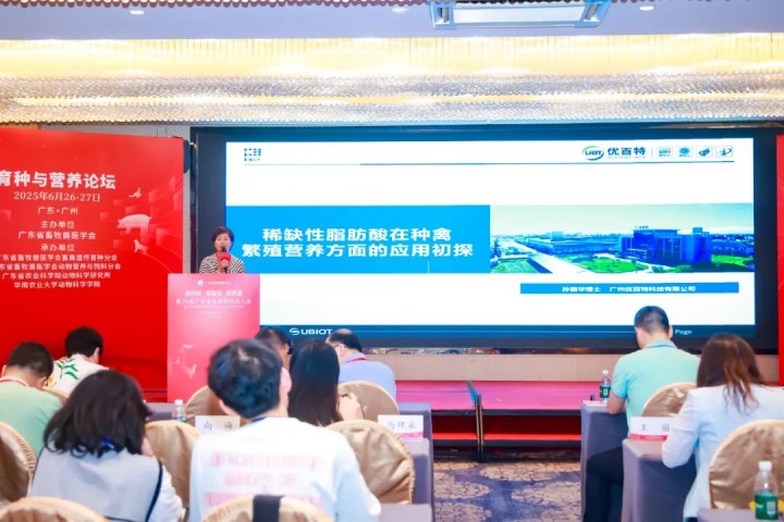 大会首日(6月26日上午10:10),优百特生命科学研究院院长、农牧行业油脂化工跨界融合领军人才——孙丽华博士,在【育种与营养论坛】上分享了题为《稀缺性脂肪酸在种禽繁殖营养方面的应用》的专题报告。系统阐述了稀缺性脂肪酸的作用机理、理想模型构建以及在种禽饲料中的精准应用方案,为种禽高效、健康养殖提供了创新性的营养解决思路。同时,孙博士深入剖析了种禽繁殖性能提升面临的营养挑战,指出特定稀缺性脂肪酸在调控种禽内分泌、改善生殖器官健康、提升种蛋品质与受精率、保障雏禽活力等方面扮演着不可替代的关键角色。