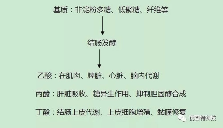 短链脂肪酸,也称挥发性脂肪酸,主要存在于乳脂及一些蔬菜和水果中,其中反刍动物乳脂中的短链脂肪酸含量是最高的,在常用动植物中是不存在短链脂肪酸的。短链脂肪酸在体内起重要生理作用,但这种起重要作用的短链脂肪酸并非来自食物摄取和体内代谢合成,而是由食物中的低聚糖、抗性淀粉、纤维等不被消化的碳水化合物在结肠内经微生物发酵而产生的,包括乙酸、丙酸及丁酸,其中以丁酸为主。
